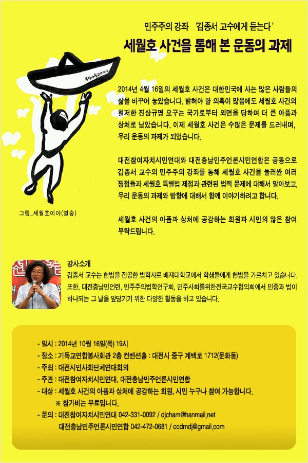 대전참여자치시민연대와 대전충남민언련 공동으로 '김종서 교수에게 듣는다-세월호 사건을 통해 본 운동의 과제' 민주주의 강좌를 진행합니다. 세월호 사건의 아픔과 상처에 공감하는 시민의 많은 참여 부탁드립니다.