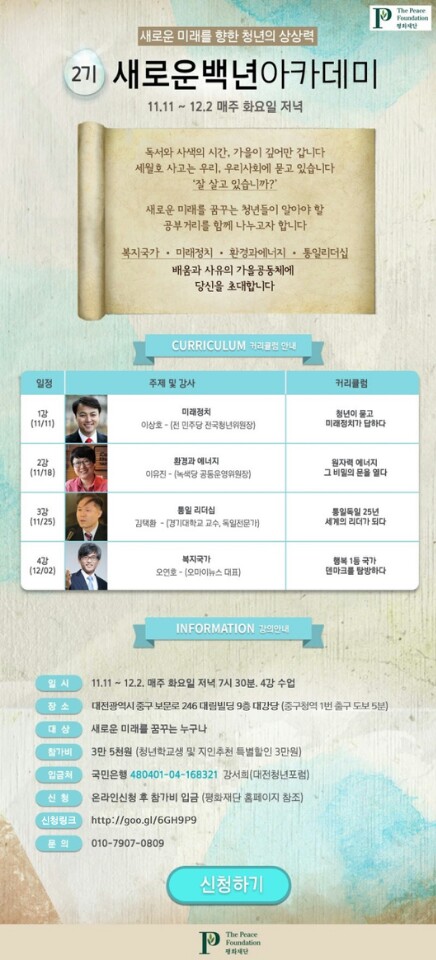 대전청년학교 ^^ 새로운 백년 아카데미 - 미래,환경,통일,복지 함께해요^^ 상세내용