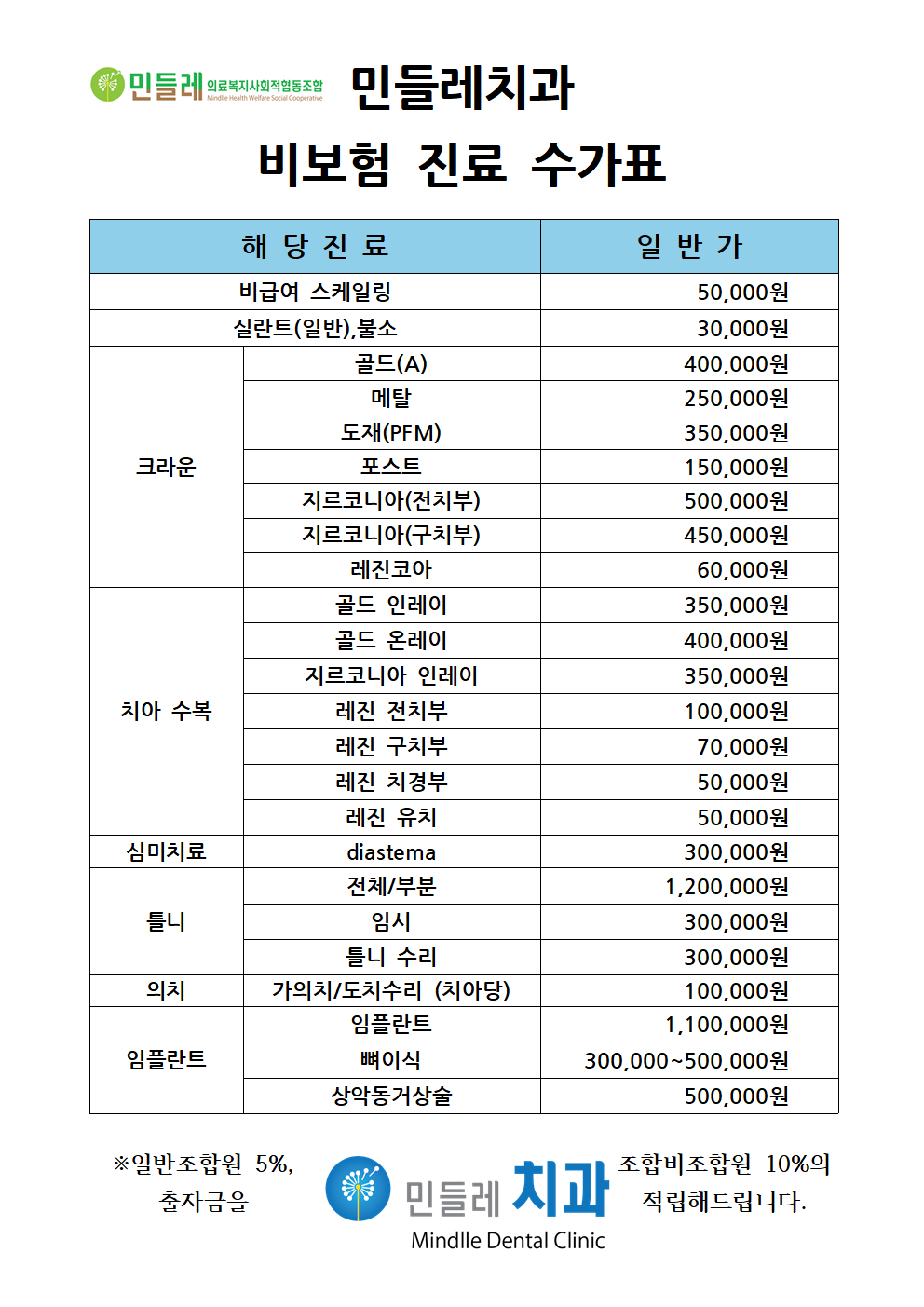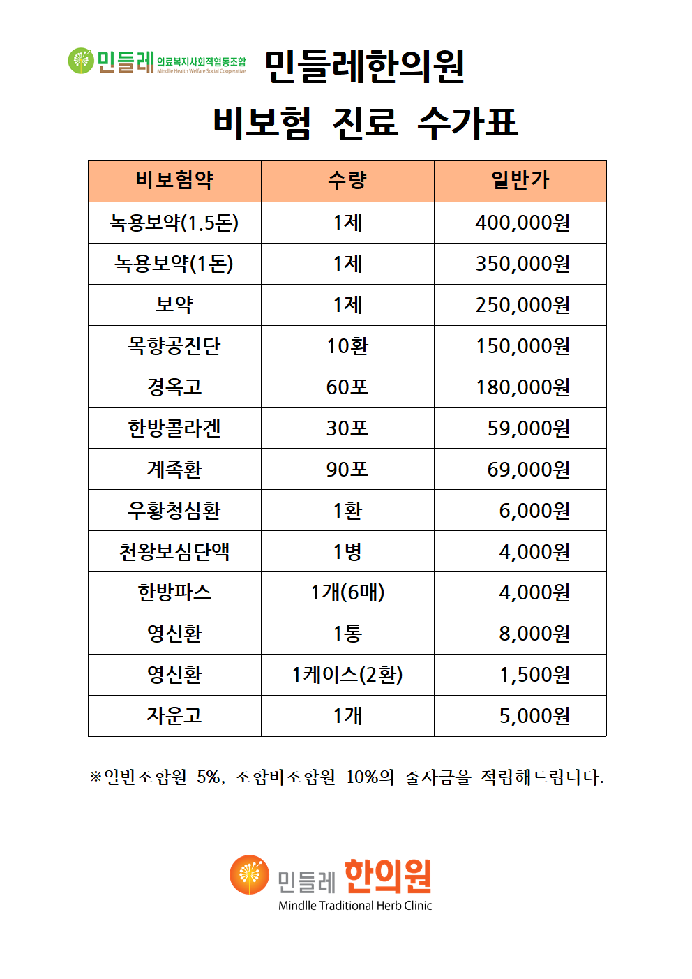 민들레 일차의료센터 비보험 진료 수가표 상세내용