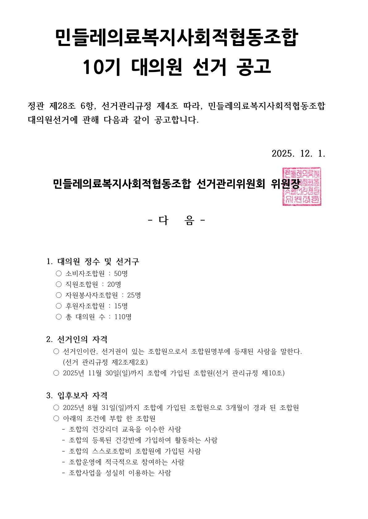 10기 대의원 선거 공고