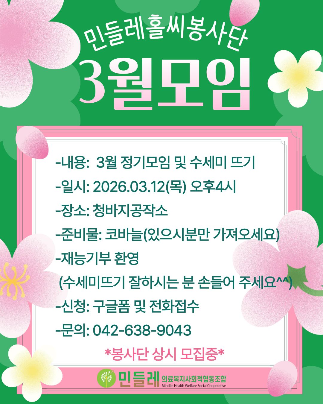 | 작성자 | 민들레의료복지사회적협동조합(mindlle) | 작성일 | 2026-03-03 | 조회수 | 1100 |