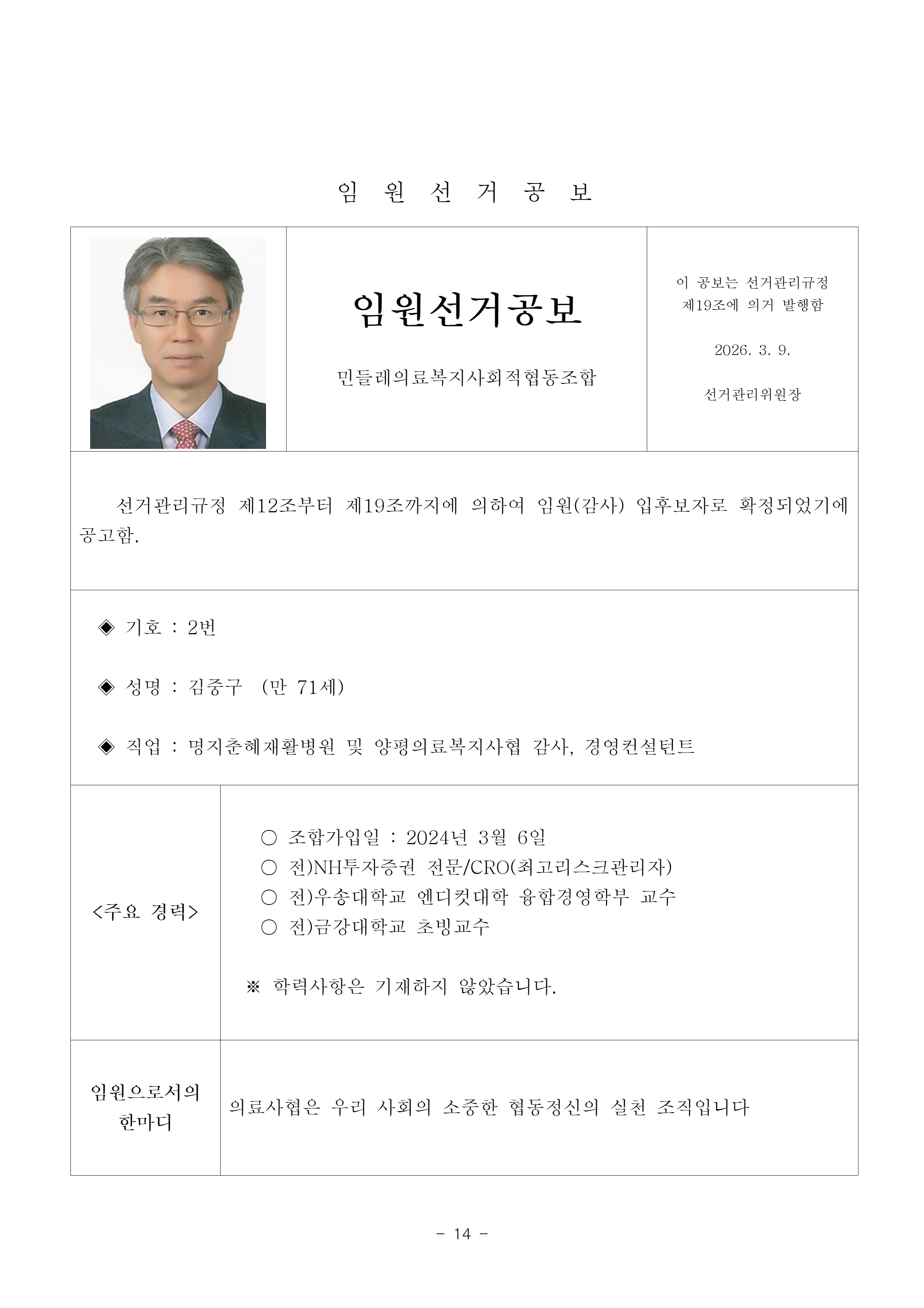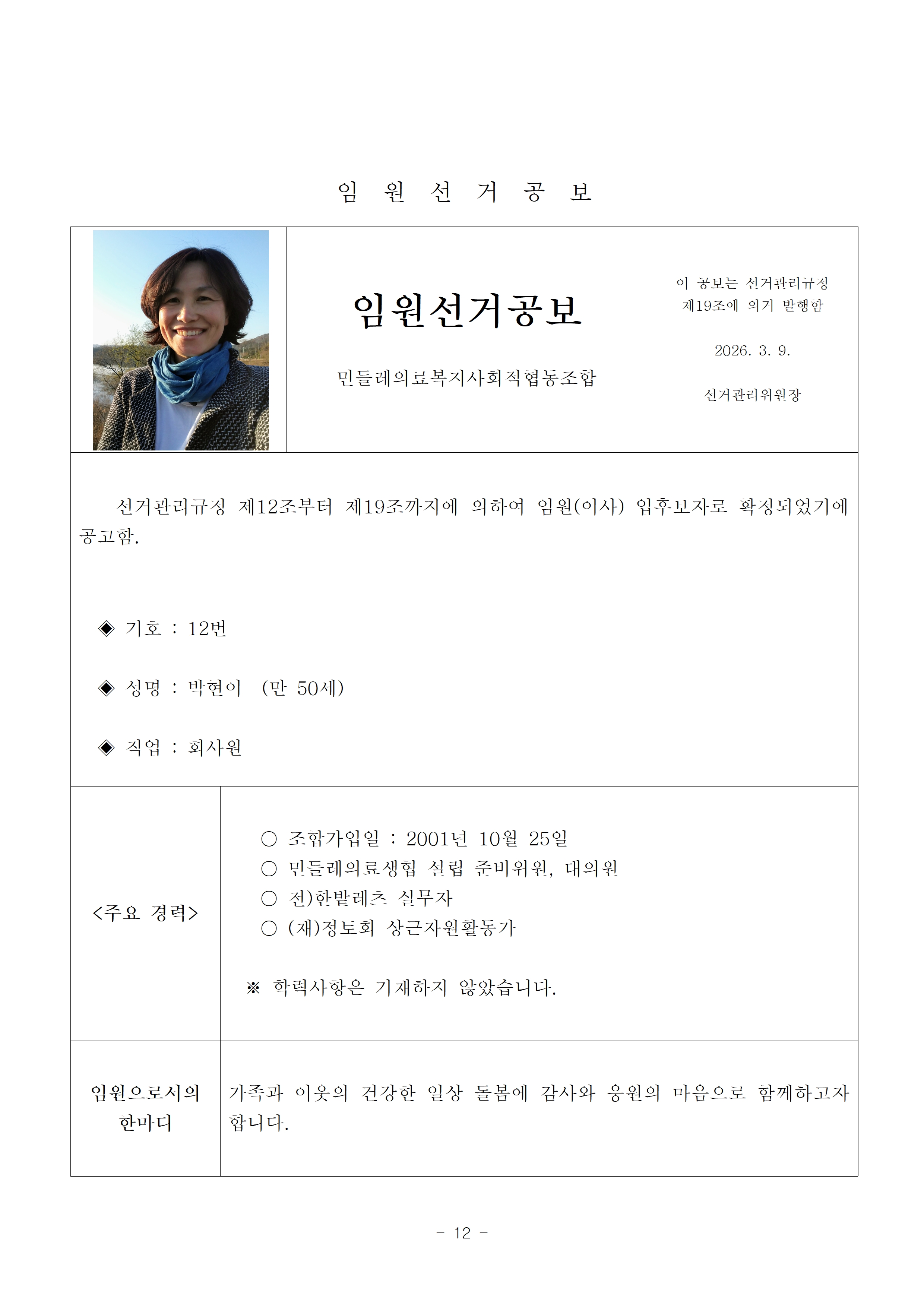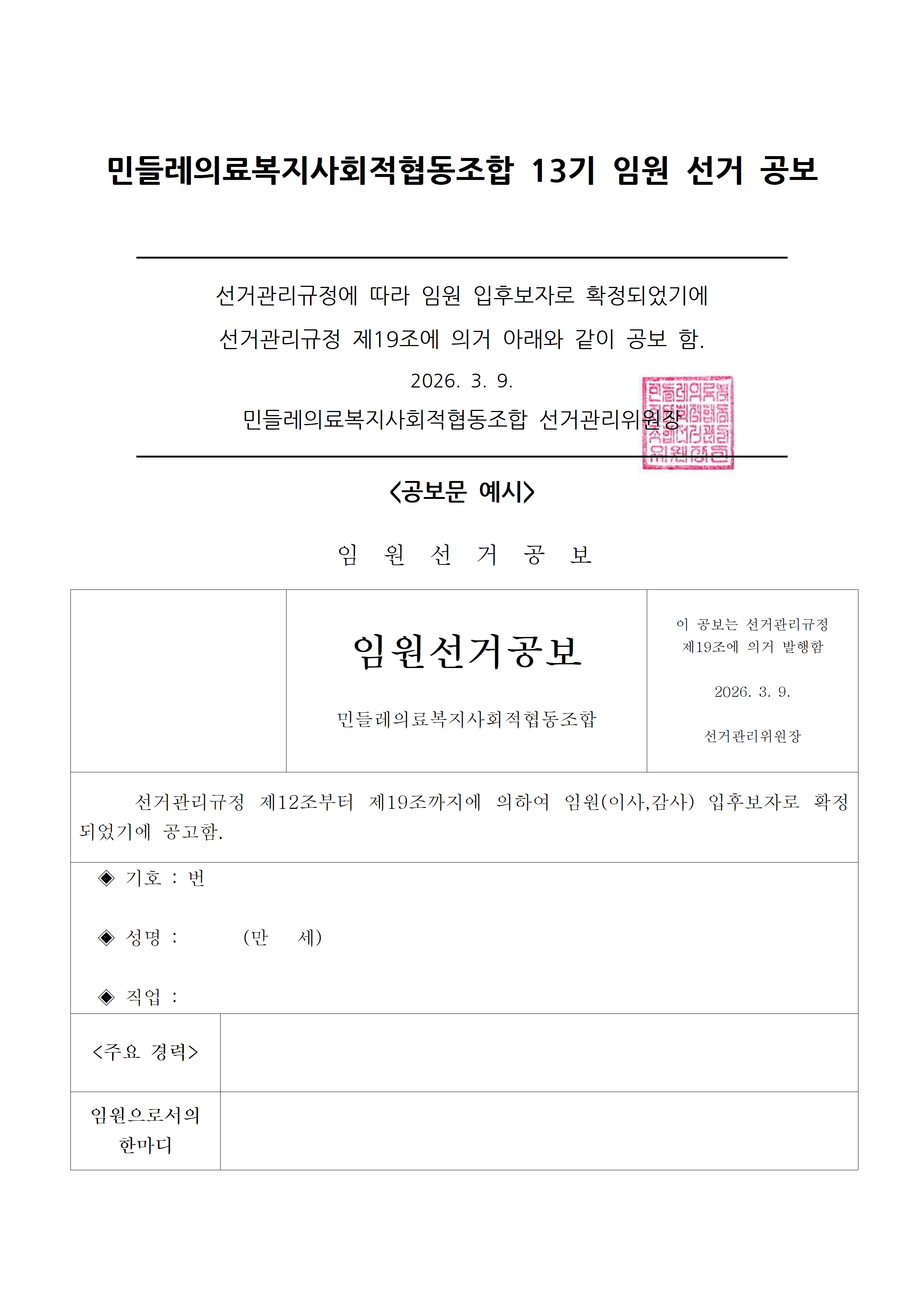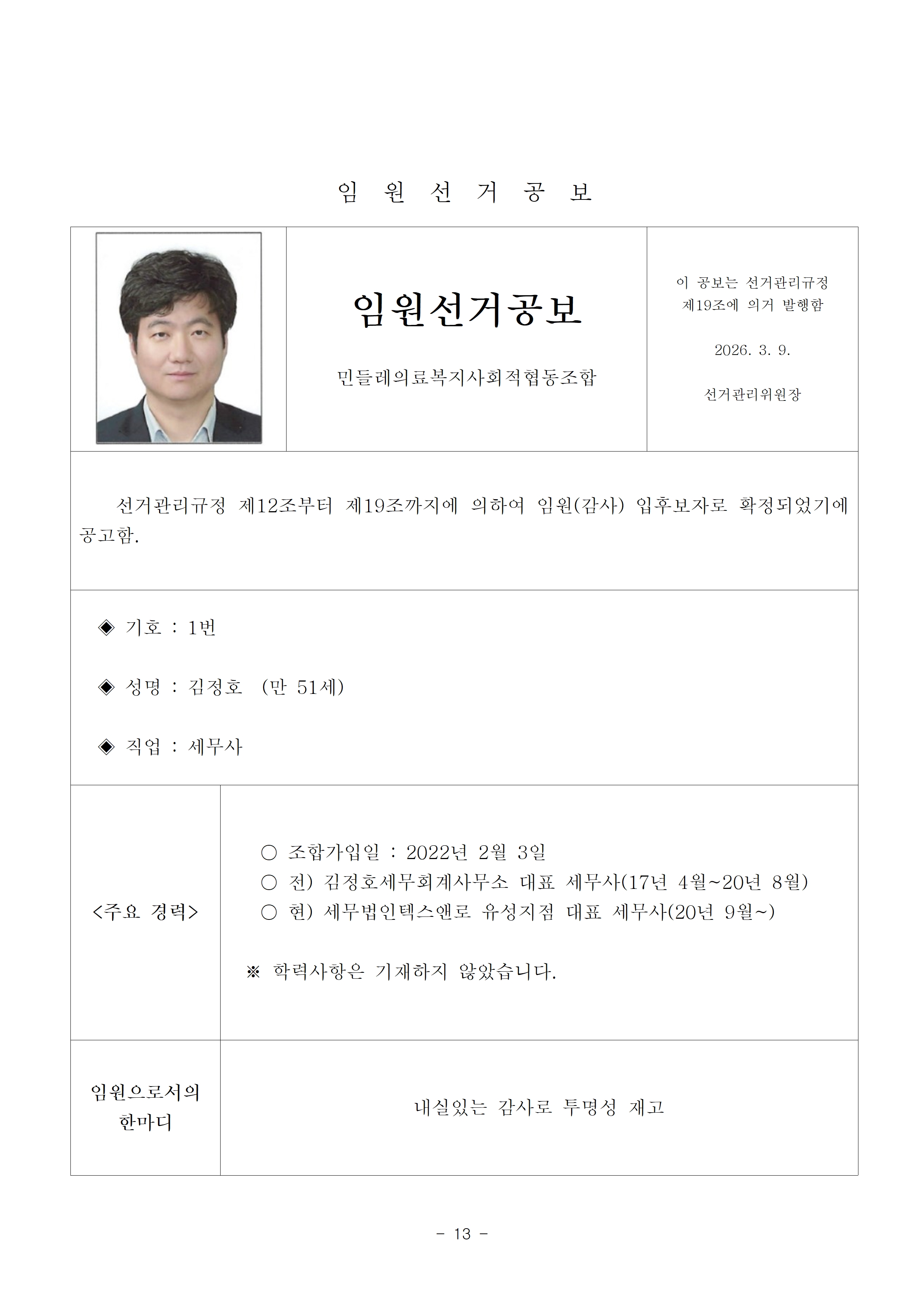 2026년 13기 임원(이사, 감사)선거 공보 상세내용
