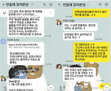 7월 22일~8월 4일 사회적 거리두기 4단계 적용으로 인해 각자의 자리에서 독서를 하고, 독서 진행률을 체크함. 단톡방을 통해 제한적인 토론을 함. 8월 예정인 저자와의 만남 준비에 관한 논의를 진행함.