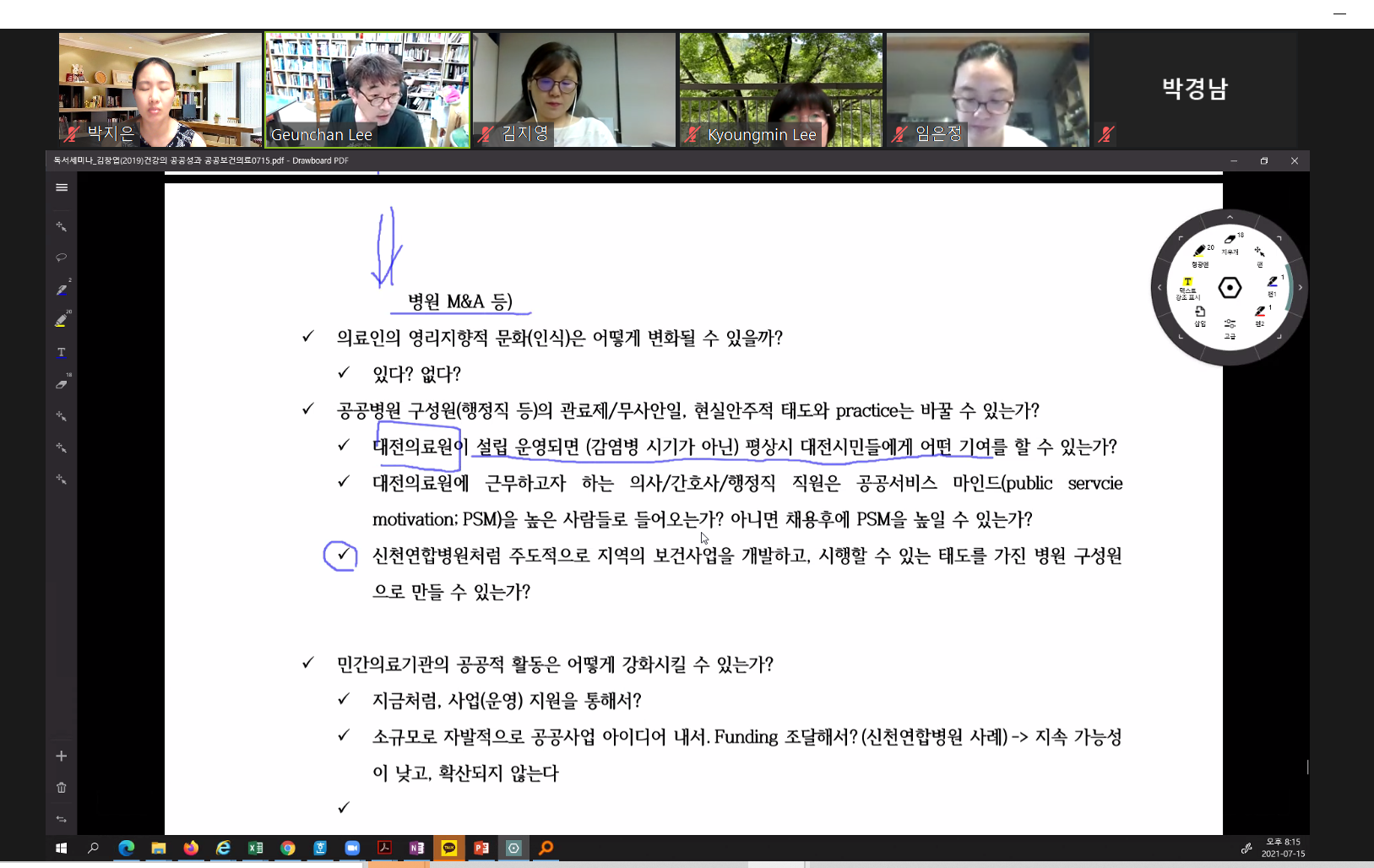 "건강의 공공성과 공공보건의료" 책을 읽고 토론함. 지역사회 관점의 사회권력에 대한 고민, 시민 참여와 시민단체 참여 사이의 괴리. 자기 이해관계와 공공성이 부딪히는 지점. 대전의료원 설립과 공공성 강화를 위한 고민들을 나눔. 저자와의 만남에 대한 의견과 준비 논의 등